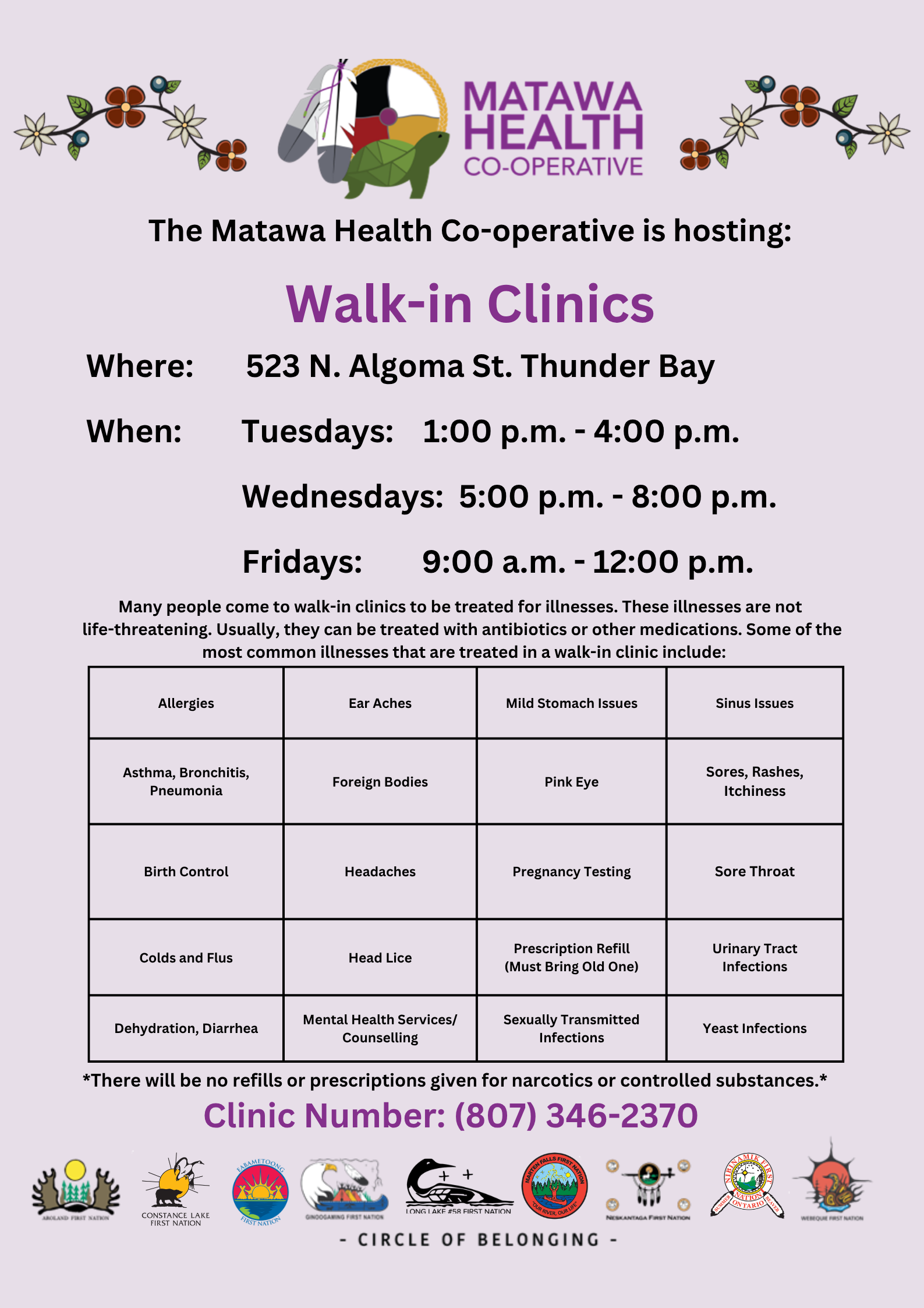 You can contact Matawa Health Co-operative by phone at (807) 346-2370 or by email mhc-reception@matawa.on.ca. Also be sure to follow the Matawa Health Co-operative on Facebook.