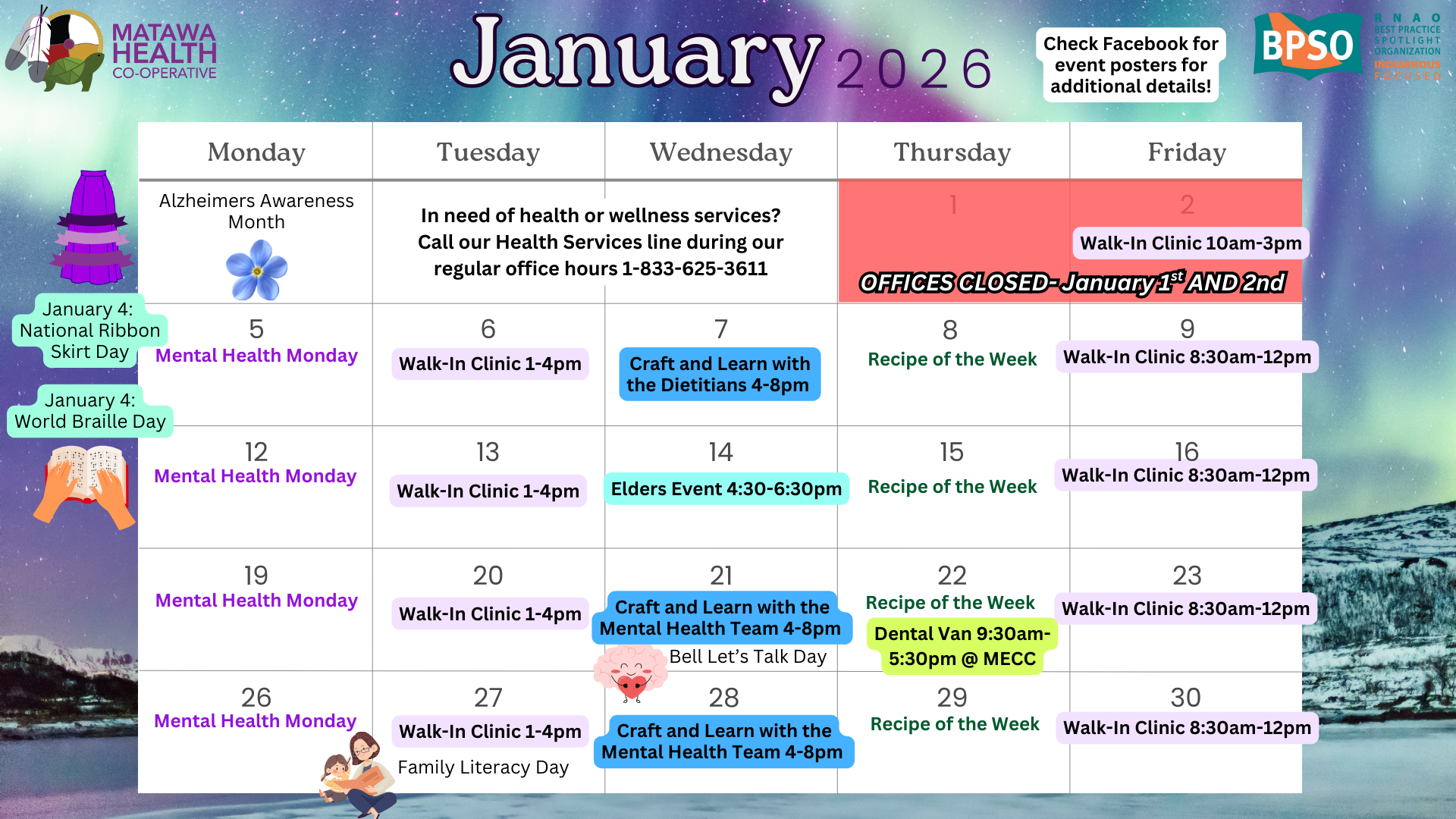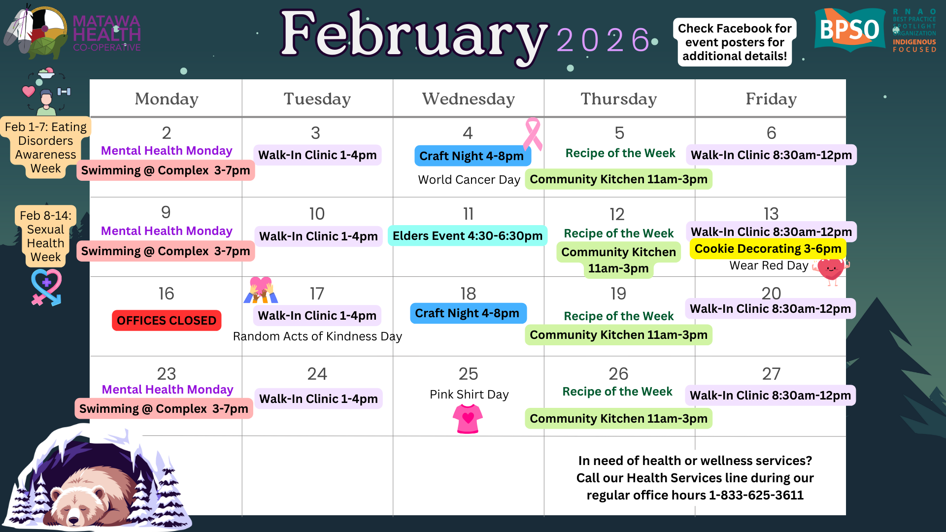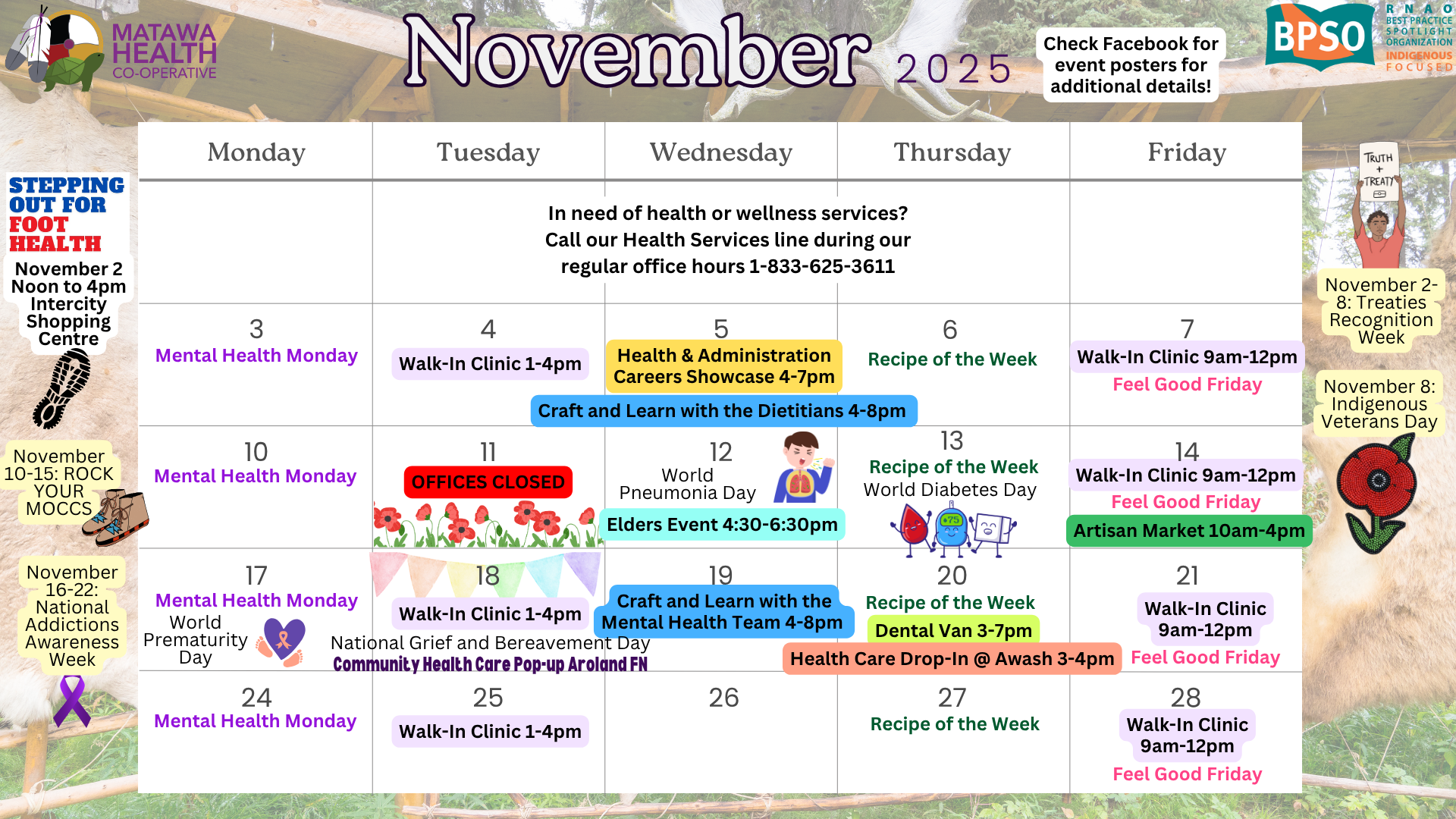 You can contact Matawa Health Co-operative by phone at (807) 346-2370 or by email mhc-reception@matawa.on.ca. Also be sure to follow the Matawa Health Co-operative on Facebook.