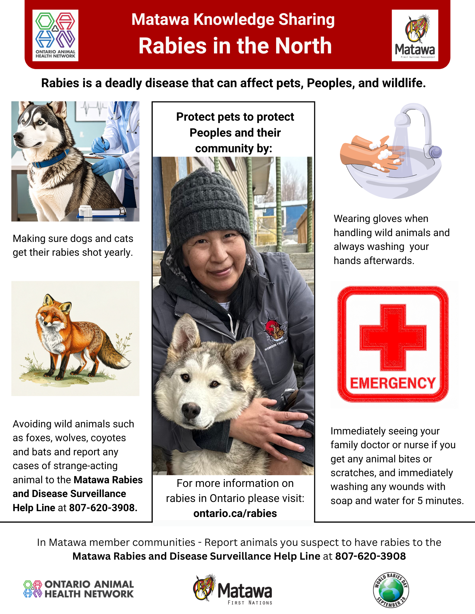Rabies is endemic in foxes in northern Ontario, but surveillance in the region is limited. The Matawa Rabies and Diseases Surveillance Helpline, launched in collaboration with the Ontario government, aims to improve rabies surveillance by offering Matawa members a place to ask questions and report suspected rabies cases.
