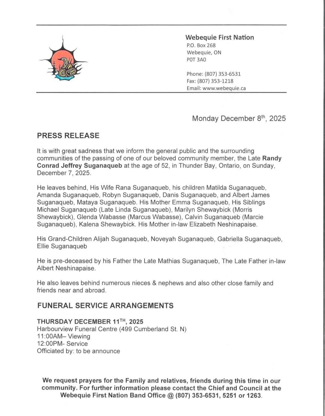 It is with great sadness that we inform the general public and the surrounding communities of the passing of one of our beloved community member, the Late Randy Conrad Jeffrey Suganaqueb at the age of 52, in Thunder Bay, Ontario, on Sunday, December 7, 2025.